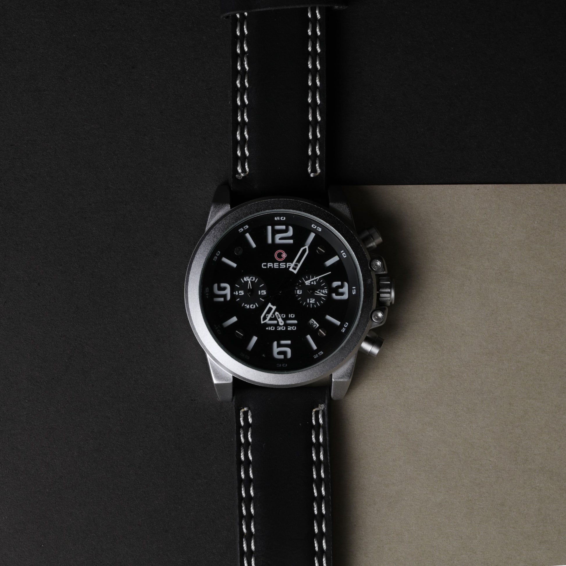 Sleek and bold, The Midnight Chrono features a black dial, stainless steel case, and a leather strap with contrast stitching. Perfect for any occasion, it blends style with precision.